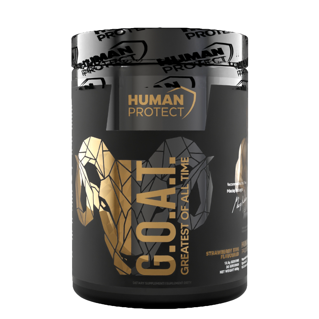Human Protect GOAT to zaawansowana przedtreningówka premium sygnowana przez Macieja Nabagło. Zawiera cytrulinę, AAKG, beta-alaninę, kofeinę i adaptogeny, które wspierają pompę mięśniową, koncentrację i wydolność. Najwyższa jakość – Greatest Of All Time wśród boosterów treningowych.